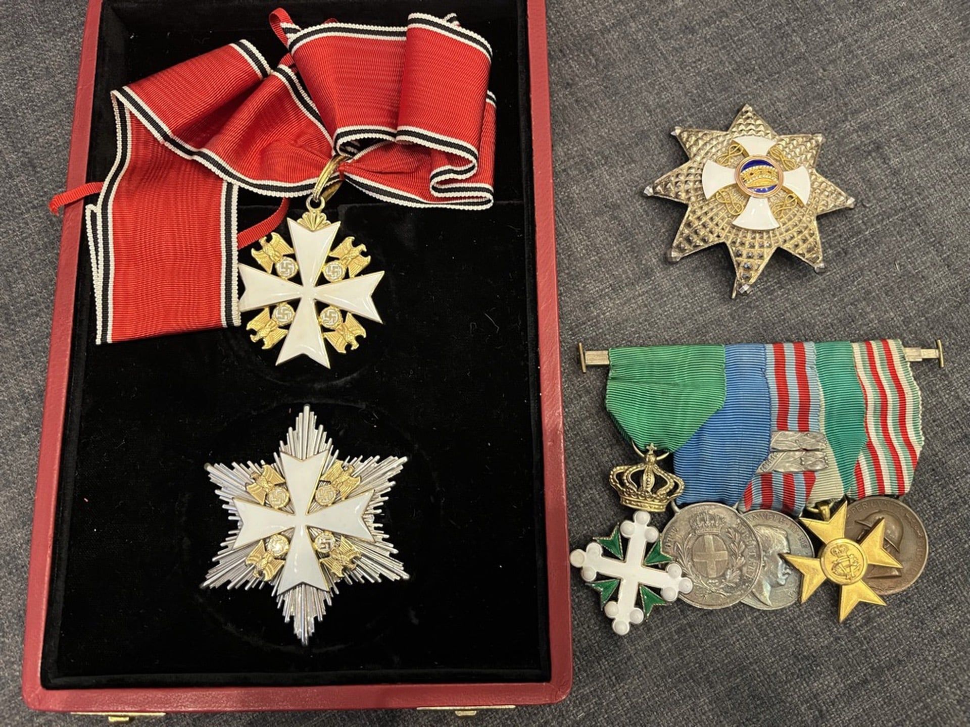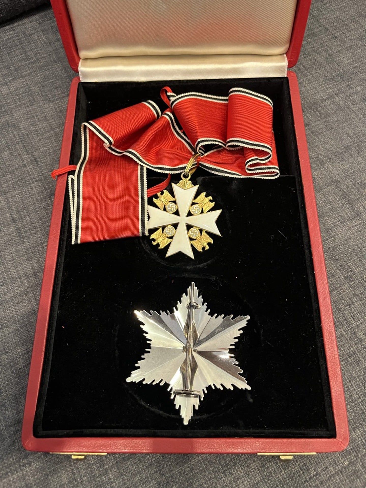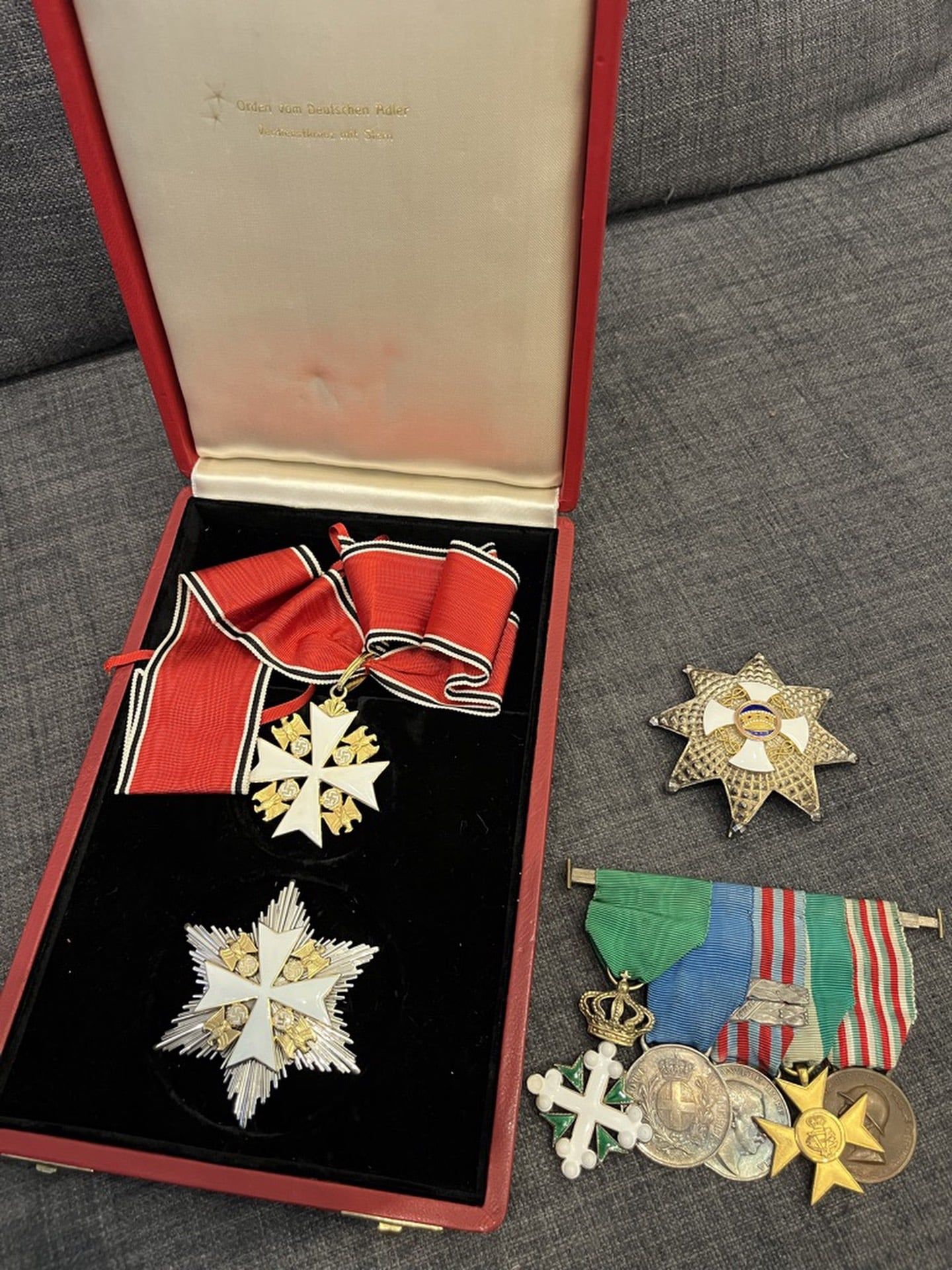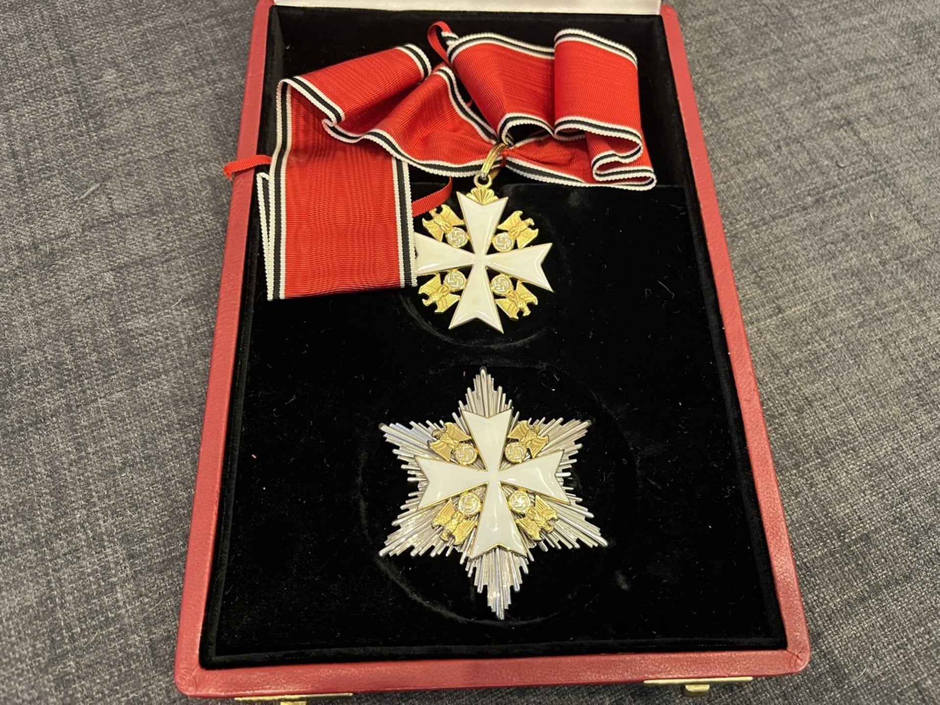 Medagliere e Decorazione di Grande Ufficiale dell’Ordine dell’Aquila Tedesca appartenuti ad un Generale del Regio Esercito. Questo Ordine fu istituito da Adolf Hitler il 1° maggio 1937. come ricompensa per quei cittadini stranieri e per quei tedeschi residenti all’estero che si fossero distinti in meriti o servizi particolari in favore della causa nazista. Oltre che alle principali personalità politiche simpatizzanti della Germania del tempo (Francisco Franco, Re Boris di Bulgaria, l’Ammiraglio Horty, il rumeno Antonescu, il finlandese Mannerheim ecc.), questa distinzione fu spesso conferita ad Ambasciatori stranieri in Germania e a gerarchi italiani del Partito Fascista oltre che a militari e civili. Si componeva in sei classi e due medaglie al merito (anche se la prima classe, una speciale Gran Croce con brillanti, era stata creata appositamente per Mussolini e fu conferita in quell’unica occasione. L’Ordine era poi ripartito in due divisioni: una civile ed una militare. In quest’ultimo caso la decorazione veniva conferita con due spade incrociate al centro della croce (mit Schwertern). Le classi erano così composte: