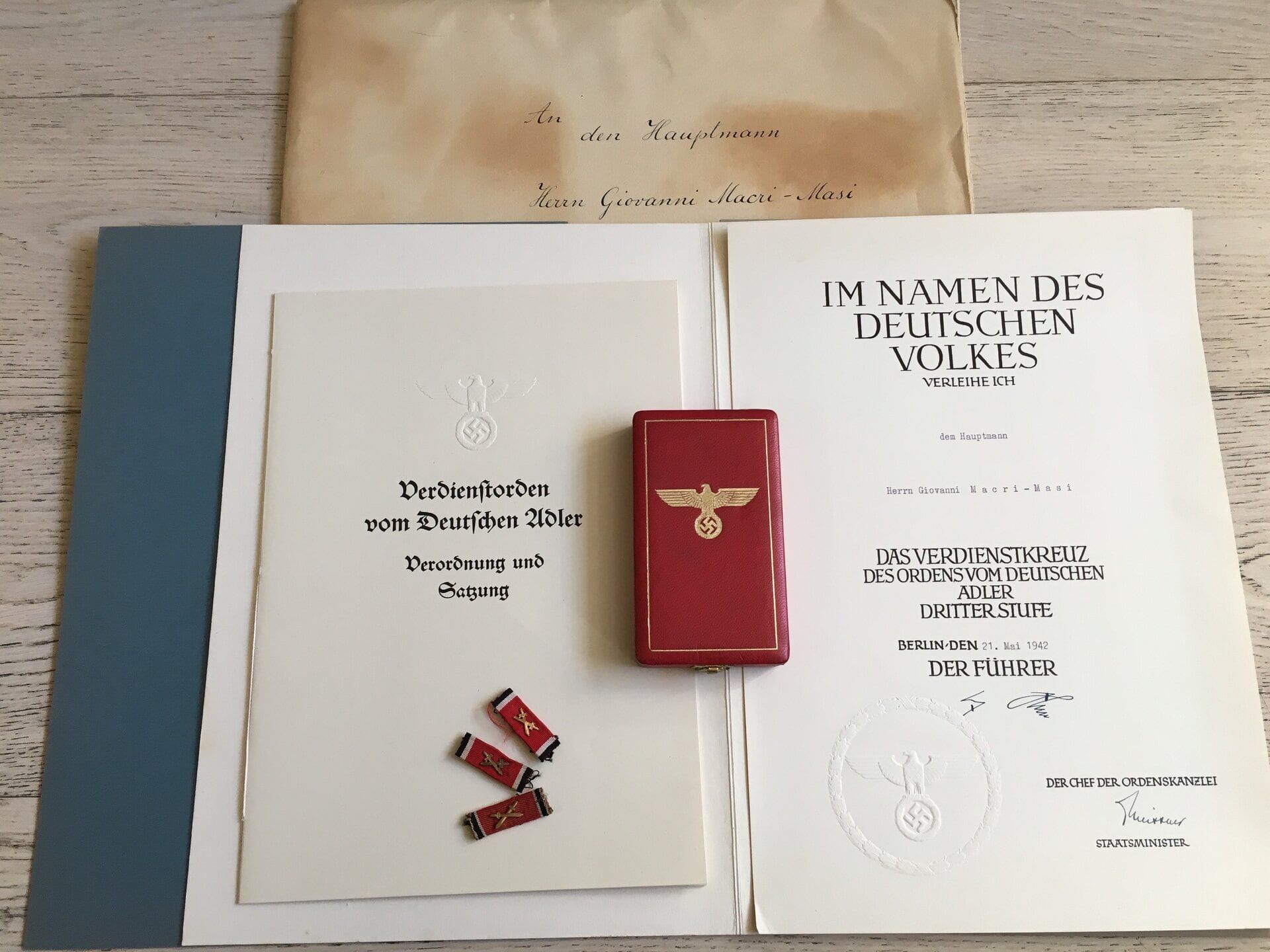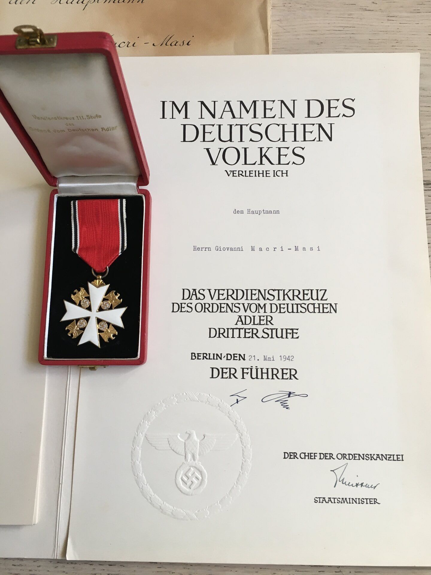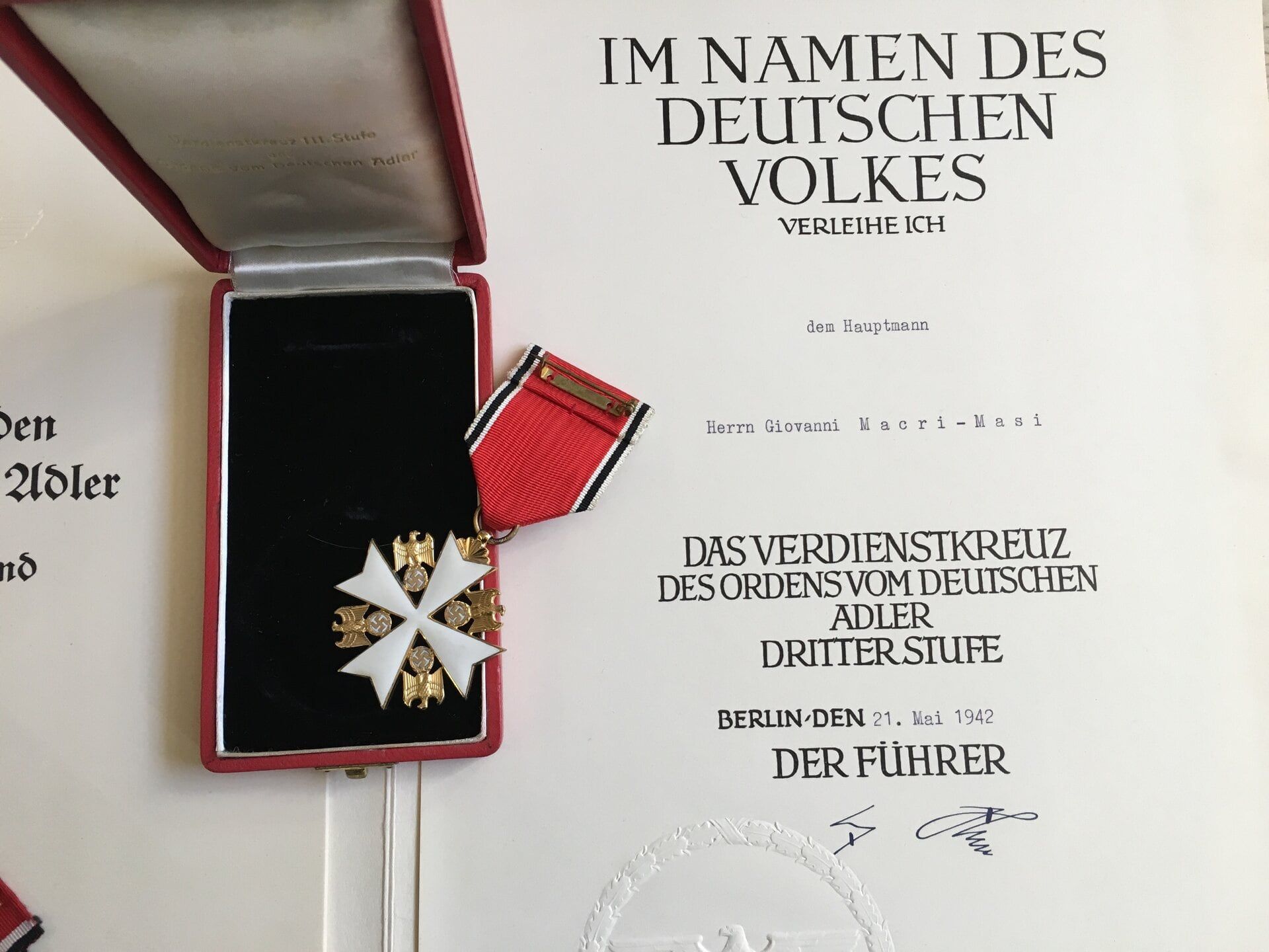 Croce di terza classe dell’Ordine dell’Aquila Tedesca con relativo attestato.