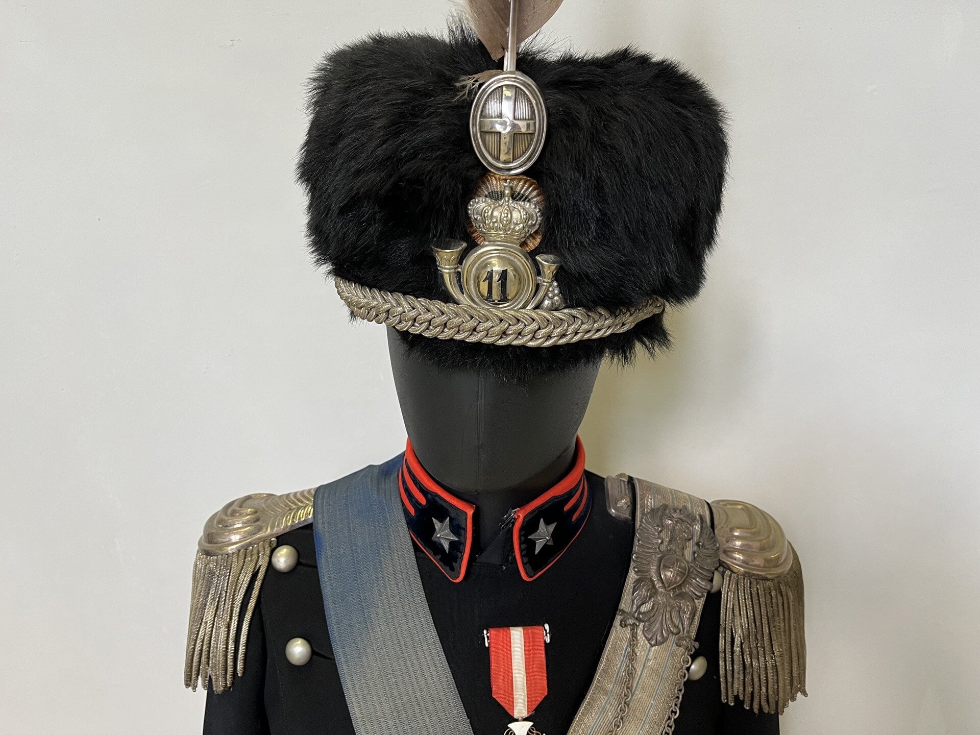Capitano dell’11 Reggimento Cavalleggeri di Foggia in “grande uniforme” modello 1902. Colbacco in pelliccia di foca completo di fregi argentati e penna d’aquila per “grande uniforme”. Bandoliera argentata con casettina.